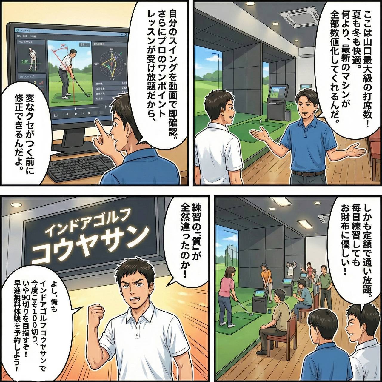 数値と映像でスイング分析ができ、コーチによるアドバイスも受けられる当店はゴルフスタートに最適な環境です。
